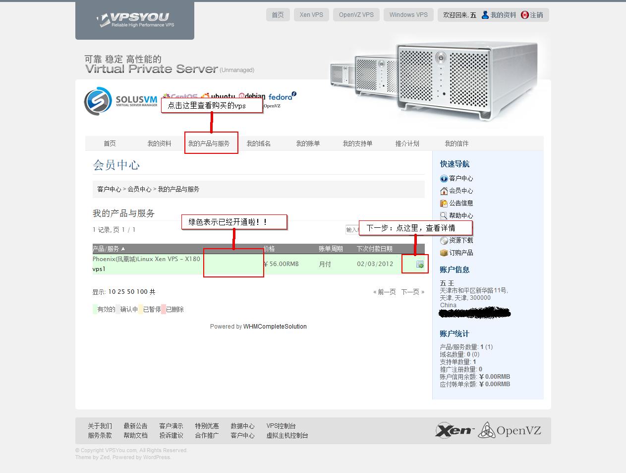 如果没有成功回到vpsyou,可以点击网站下面的“客户中心”,用最后填入的邮箱和密码登录,进入如下界面: