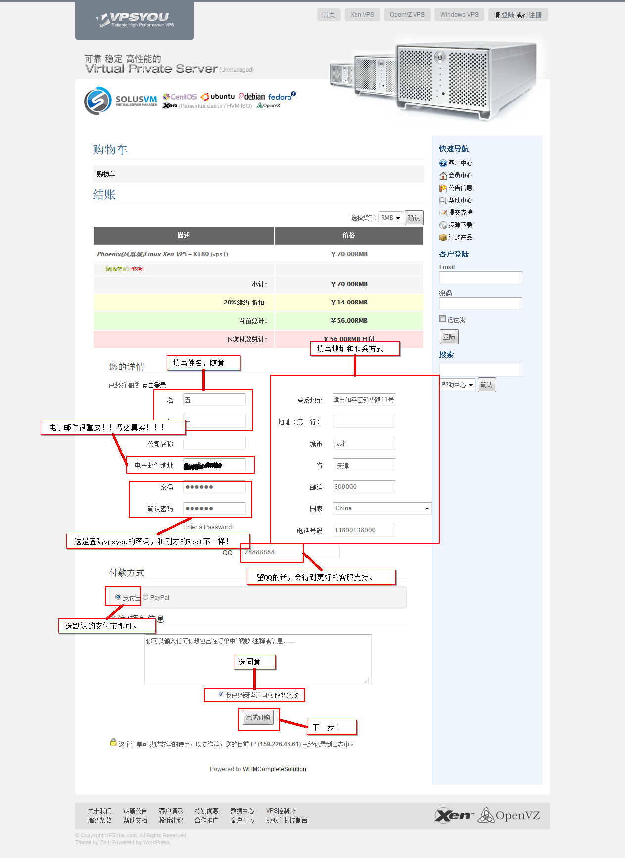 但我相信看到这里的童鞋都是没有帐号的,于是教大家填写如下(本账号用于将来登录vpsyou并管理你的vps,请认真对待):