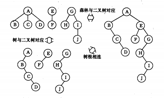 例如上面A~J的树,先序遍历森林的结果就是:A B C D E F G H I J