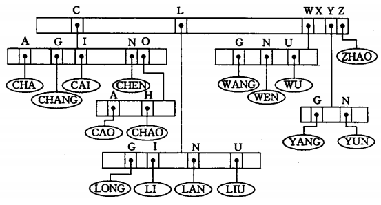 查找过程是,从根结点出发,顺着first查找,如果相等,继续下一个first。否则沿着next查找。直到到了空指针为止。此时若仍未完成key的匹配,查找不成功。