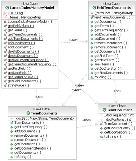 • LuceneIndexMemoryModel class contains FieldTermDocuments class for every field currently present in memory. It also provides all of the internal APIs necessary for implementation of IndexReader/IndexWriter.