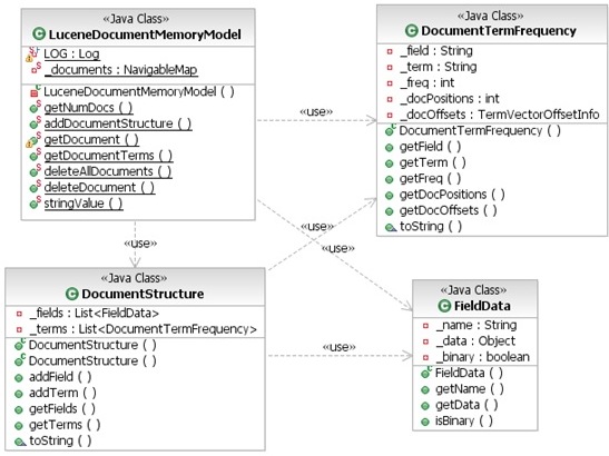 • LuceneDocumentMemoryModel class contains a map of DocumentStructure class for every indexed document.