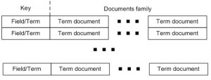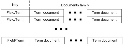 HBase index table (Figure 6) is the workhorse of the implementation. This table has an entry (row) for every field/term combination known to a Lucene instance, which contains one column family - documents family. This column family contains a column (named as a document ID) for every document containing this field/term. The content of each column is a value of TermDocument class.