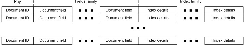 HBase document table (Figure 7) stores documents themselves, back references to the indexes/norms, referencing these documents and some additional bookkeeping information used by Lucene for documents processing. It has an entry (row) for every document known to a Lucene instance. Each document is uniquely identified by a document ID (key) and contains two column families - fields family and index family. Fields column family contains a column (named as a field name) for every document's field stored by Lucene. The column value is comprised of the value type (string or byte array) and the value itself. Index column family contains a column (named as a field/term) for every index referencing this document. The column value include document frequency, positions and offsets for a given field/term.