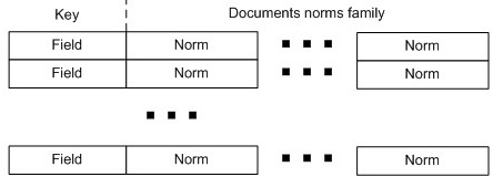 HBase norm table (Figure 8) stores document norms for every field. It has an entry (row) for every field (key) known to a Lucene instance. Each row contains a single column family - norms family. This family has a column (named as document ID) for every document for which a given field's norm needs to be stored.