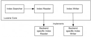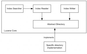 A high-level Lucene architecture [2] is presented at Figure 1. Its main components are IndexSearcher, IndexReader, IndexWriter and Directory. IndexSearcher implements the search logic. IndexWriter writes reverse indexes for each inserted document. IndexReader reads the content of indexes in support of IndexSearcher. Both IndexReader and IndexWriter rely on Directory, which provides APIs for manipulating index data sets, which are directly mimicking file system API.