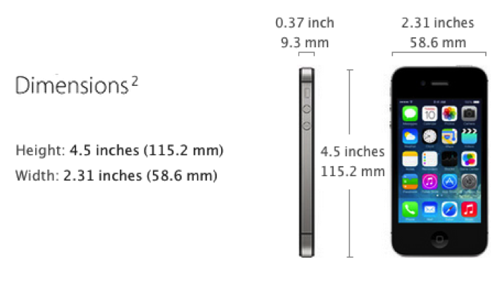 上表中的宽高(width/height)为手机的物理尺寸,包括显示屏和边框。 以下为iPhone4s的宽高示意图: