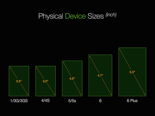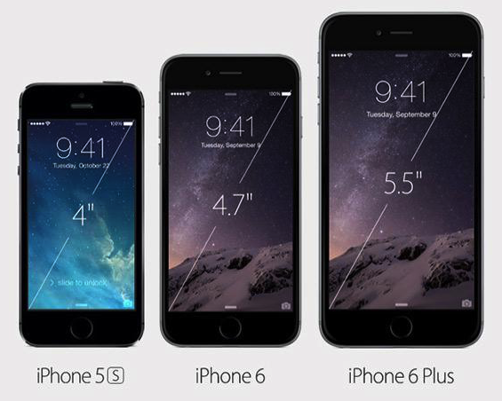 我们通常所说的iPhone5屏幕尺寸为4英寸、iPhone6屏幕尺寸为4.7英寸,指的是显示屏对角线的长度(diagonal)。 以下为iPhone5~6+的屏幕尺寸规格示意图: