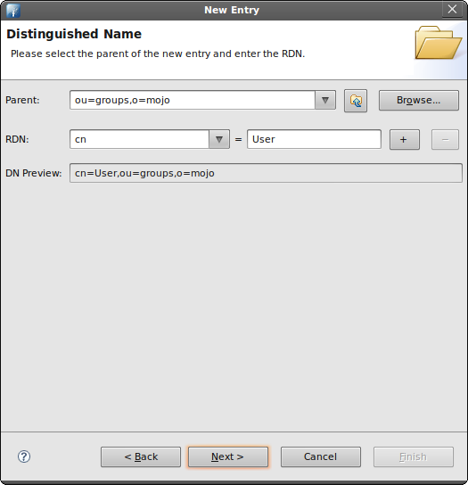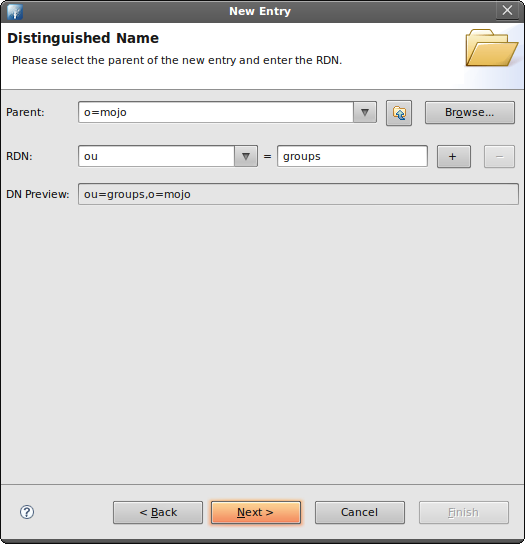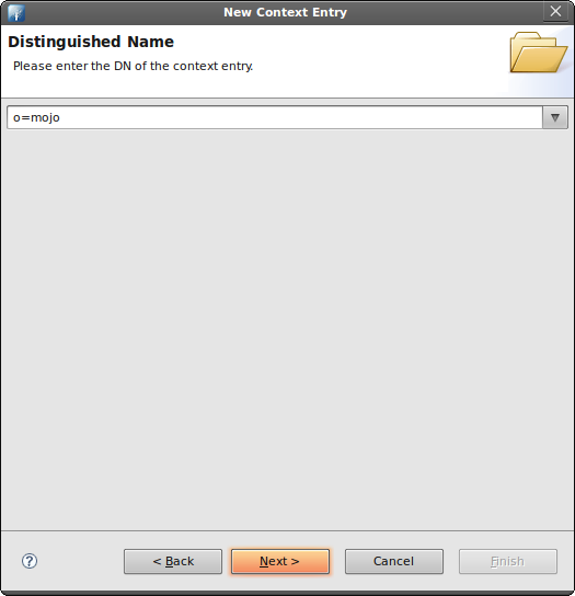 4. Click Next. Now you need to enter a Distinguished Name (dn). Click on the pulldown menu. Select o=mojo.