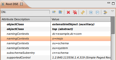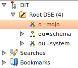 Notice the namingContexts attribute. The namingContexts o=mojo shows in the lists. However it doesn't show under the Root DSE tree because we need to add the organization manually in the tree.