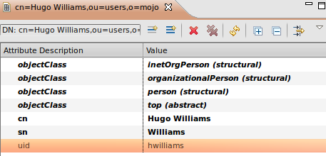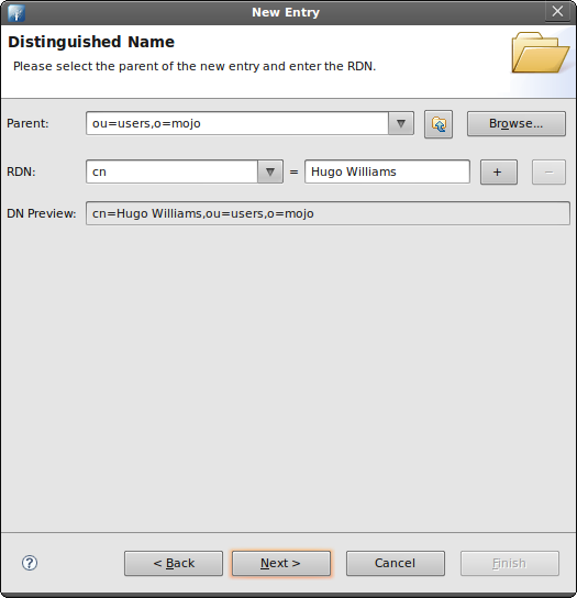 The DN Preview should read cn=Hugo Williams,ou=users,o=mojo (cn represent Common Name).
