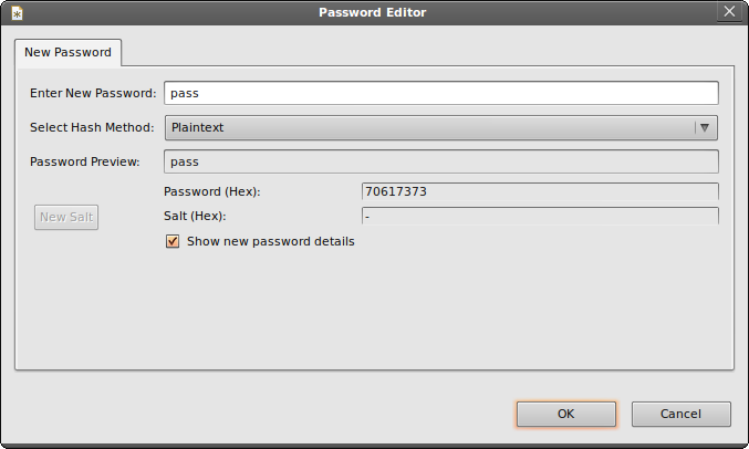 16. You will be asked to enter a password. Enter pass as the new password. Make sure that the Select Hash Method is set to Plaintext