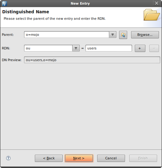 On the RDN field enter ou. On the value field enter users. The DN Preview should read ou=users,o=mojo
