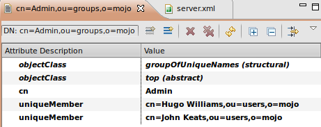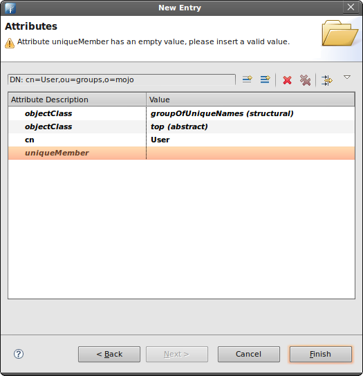 Notice there's a uniqueMember attribute. We'll be placing the Distinguished Name (dn) of our users in this entry. One uniqueMember attribute will represent one user. This means we need to add one more uniqueMember attributes for a total of two uniqueMember attributes.