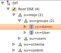 We'll make the names a little bit formal, and make it conform with the naming convention of LDAP. For the topmost parent, we'll retain mojo. For roles, we'll use groups instead. For identities, we'll use users