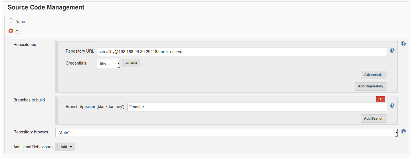 eureka配置 代码管理选择git,如果没有认证,搞一下add(推荐用直接输入的方式,毕竟ssh-keygen重启容器会消失)