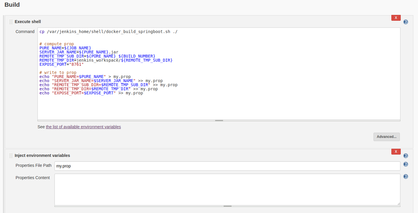 在Build中新建一个Executer shell 和 Inject environment variables,分别配置如下:
