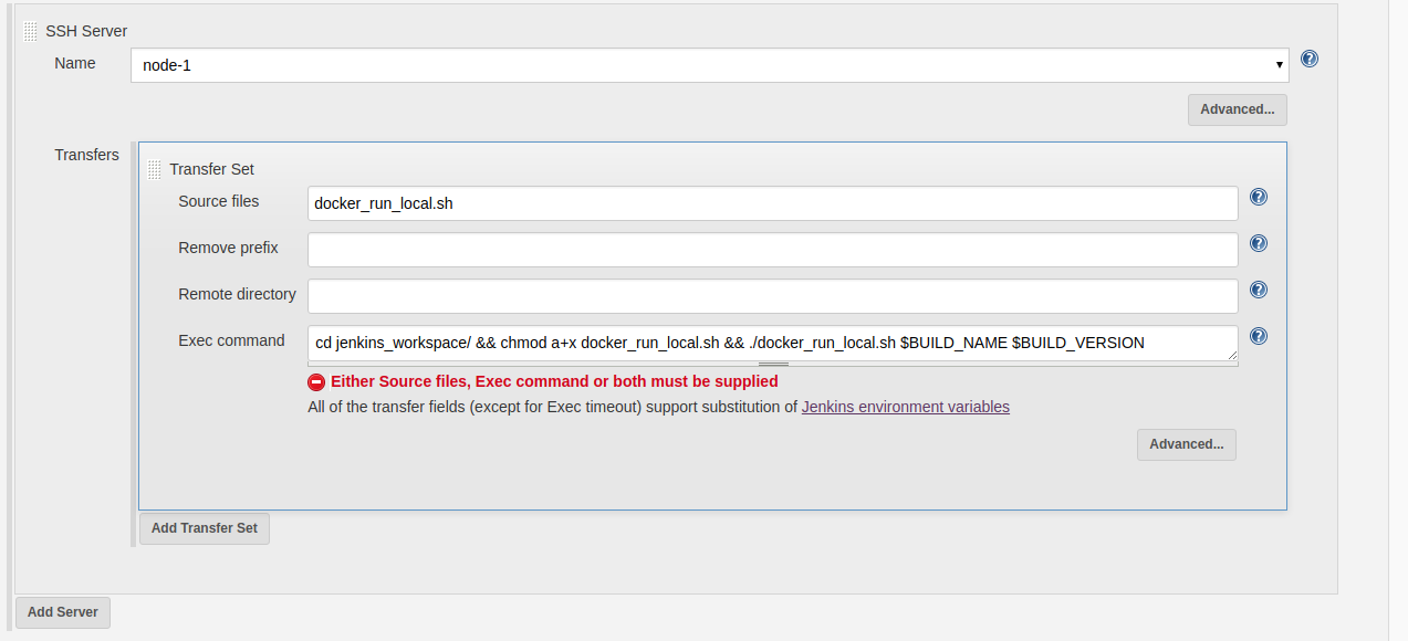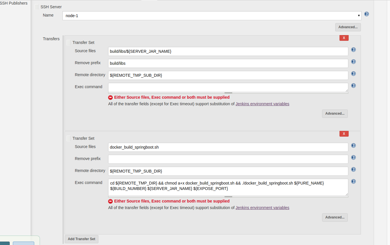 eureka-server Build中 新增 Send files or execute command OVER SSH,选择node-1 并设置2个transfer set,如下: