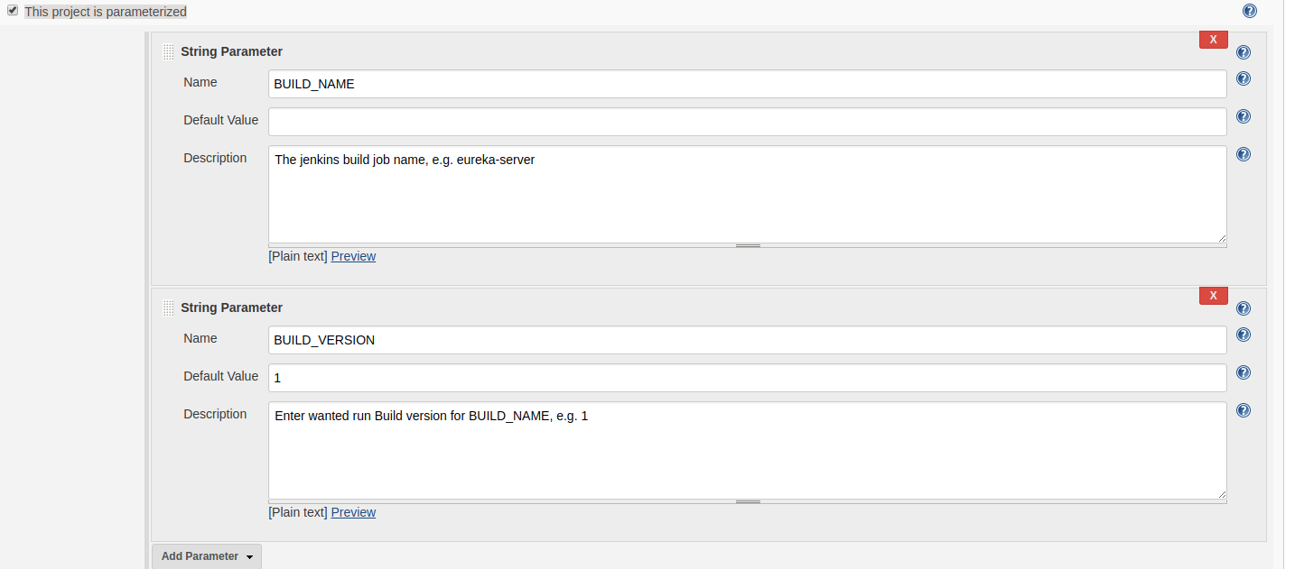 (1) 选择"This project is parameterized",并添加上述2个参数: