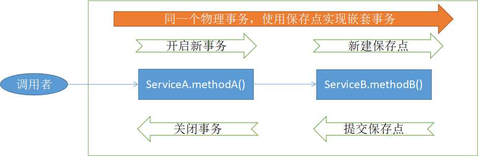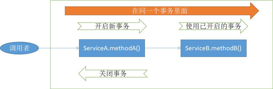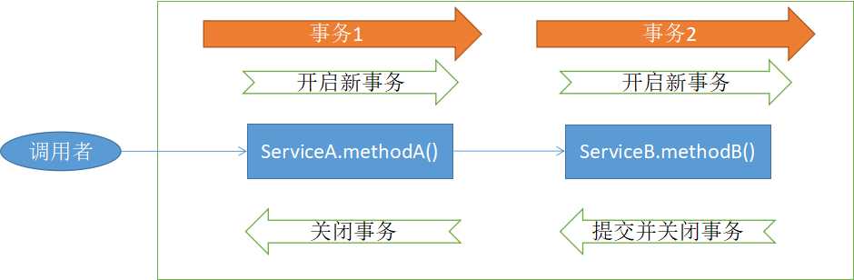 这样,在ServiceA.methodA()或在ServiceB.methodB()内的任何地方出现异常,事务都会被回滚。 即使ServiceB.methodB()的事务已经被提交,但是ServiceA.methodA()在下面异常了要回滚,那么ServiceB.methodB()也会回滚。