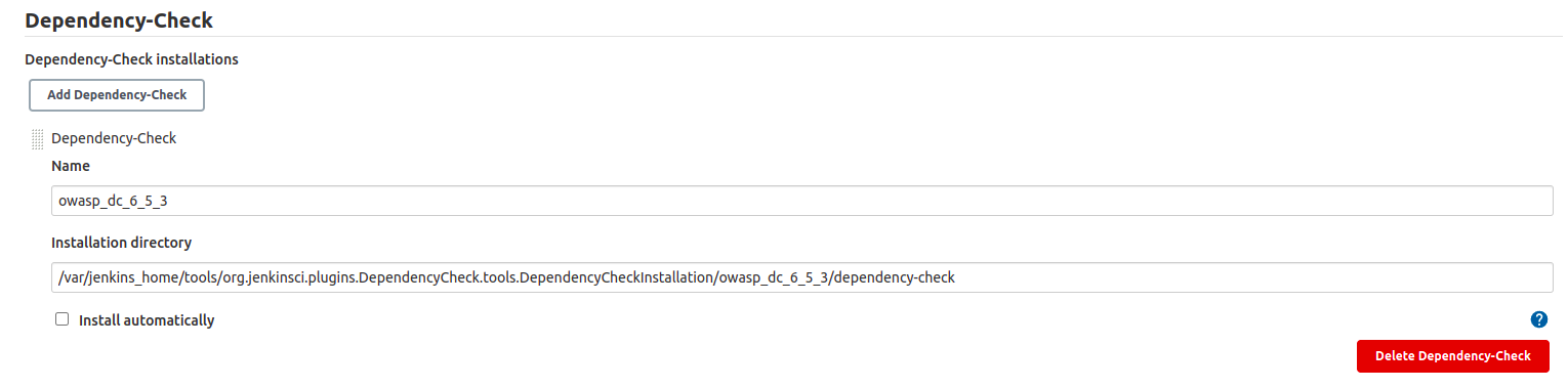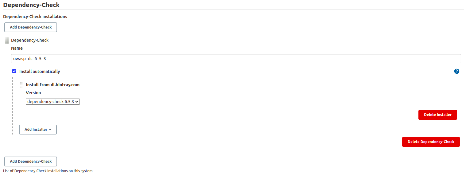 完成后在进行配置,路径为:Dashboard -> Manage Plugins -> Global Configuration,Dependency-Check,选择版本和自动安装,参见下图: