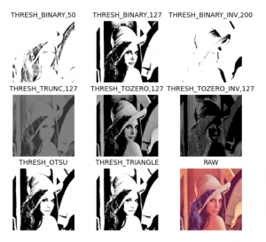 此外,上述与参数还可以 逻辑或 cv2.THRESH_OTSU、cv2.THRESH_TRIANGLE两个自动选择阀值的参数(此时需保证参数的阀值为0)