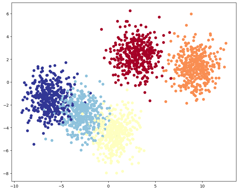from sklearn.datasets import make_blobs from sklearn.model_selection import train_test_split import torch import matplotlib.pyplot as plt SAMPLES = 2000 FEATURES = 2 CLASSES = 5 X_blob, y_blob = make_blobs(n_samples = SAMPLES, n_features = FEATURES, centers = CLASSES, cluster_std = 1.2) X_blob = torch.from_numpy(X_blob).type(torch.float) y_blob = torch.from_numpy(y_blob).type(torch.LongTensor) print(X_blob[:5], y_blob[:5]) # train / test X_blob_train, X_blob_test, y_blob_train, y_blob_test = train_test_split(X_blob, y_blob, test_size = 0.3) # figure plt.figure(figsize=(10, 8)) plt.scatter(X_blob[:,0], X_blob[:,1], c=y_blob, cmap=plt.cm.RdYlBu)