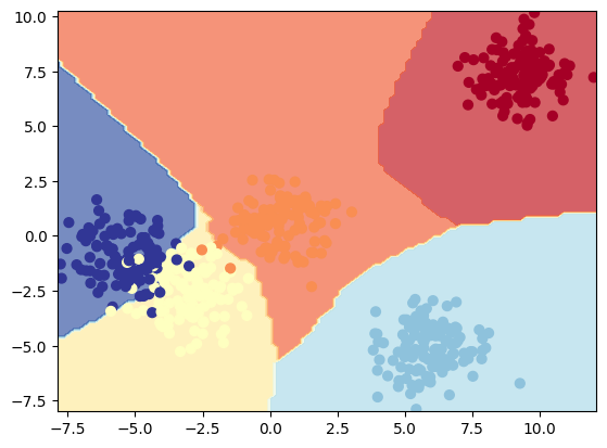 更多好用的函数在这里 https://raw.githubusercontent.com/mrdbourke/pytorch-deep-learning/main/helper_functions.pydef plot_decision_boundary(model: torch.nn.Module, X: torch.Tensor, y: torch.Tensor): """Plots decision boundaries of model predicting on X in comparison to y. Source - https://madewithml.com/courses/foundations/neural-networks/ (with modifications) """ # Put everything to CPU (works better with NumPy + Matplotlib) model.to("cpu") X, y = X.to("cpu"), y.to("cpu") # Setup prediction boundaries and grid x_min, x_max = X[:, 0].min() - 0.1, X[:, 0].max() + 0.1 y_min, y_max = X[:, 1].min() - 0.1, X[:, 1].max() + 0.1 xx, yy = np.meshgrid(np.linspace(x_min, x_max, 101), np.linspace(y_min, y_max, 101)) # Make features X_to_pred_on = torch.from_numpy(np.column_stack((xx.ravel(), yy.ravel()))).float() # Make predictions model.eval() with torch.inference_mode(): y_logits = model(X_to_pred_on) # Test for multi-class or binary and adjust logits to prediction labels if len(torch.unique(y)) > 2: y_pred = torch.softmax(y_logits, dim=1).argmax(dim=1) # mutli-class else: y_pred = torch.round(torch.sigmoid(y_logits)) # binary # Reshape preds and plot y_pred = y_pred.reshape(xx.shape).detach().numpy() plt.contourf(xx, yy, y_pred, cmap=plt.cm.RdYlBu, alpha=0.7) plt.scatter(X[:, 0], X[:, 1], c=y, s=40, cmap=plt.cm.RdYlBu) plt.xlim(xx.min(), xx.max()) plt.ylim(yy.min(), yy.max())plot_decision_boundary(model_b, X_blob_test, y_blob_test)