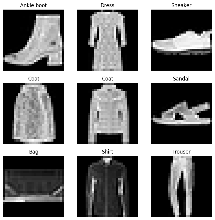 class_names = train_data.classes fig = plt.figure(figsize=(9, 9)) rows, cols = 3, 3 for i in range(1, rows * cols + 1): rand_idx = torch.randint(0, len(train_data), size=[1]).item() img, label = train_data[rand_idx] fig.add_subplot(rows, cols, i) plt.imshow(img.squeeze(), cmap='gray') plt.title(class_names[label]) plt.axis(False)
