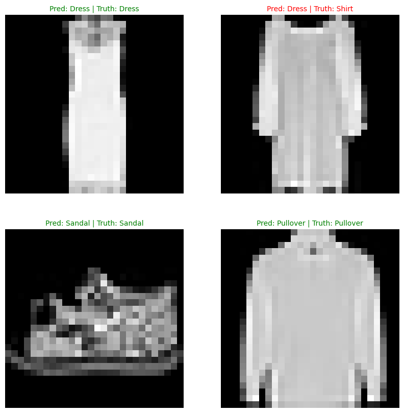 def make_predictions(model: torch.nn.Module, data: list, device: torch.device = device): pred_probs = [] model.eval() with torch.inference_mode(): for sample in data: # add batch sample = torch.unsqueeze(sample, dim=0).to(device) pred_logit = model(sample) # remove batch and max pred_prob = torch.softmax(pred_logit.squeeze(), dim=0) pred_probs.append(pred_prob.cpu()) # make into tensor return torch.stack(pred_probs) # test data import random n_samples = 4 test_samples = [] test_labels = [] for sample, label in random.sample(list(test_data), k=n_samples): test_samples.append(sample) test_labels.append(label) # make pred pred_probs= make_predictions(model=model1, data=test_samples) pred_classes = pred_probs.argmax(dim=1) # figure it plt.figure(figsize=(10, 10)) nrows = 2 ncols = 2 for i, sample in enumerate(test_samples): # Create a subplot plt.subplot(nrows, ncols, i+1) # Plot the target image plt.imshow(sample.squeeze(), cmap="gray") # Find the prediction label (in text form, e.g. "Sandal") pred_label = class_names[pred_classes[i]] # Get the truth label (in text form, e.g. "T-shirt") truth_label = class_names[test_labels[i]] # Create the title text of the plot title_text = f"Pred: {pred_label} | Truth: {truth_label}" # Check for equality and change title colour accordingly if pred_label == truth_label: plt.title(title_text, fontsize=10, c="g") # green text if correct else: plt.title(title_text, fontsize=10, c="r") # red text if wrong plt.axis(False); - Transform(预处理)