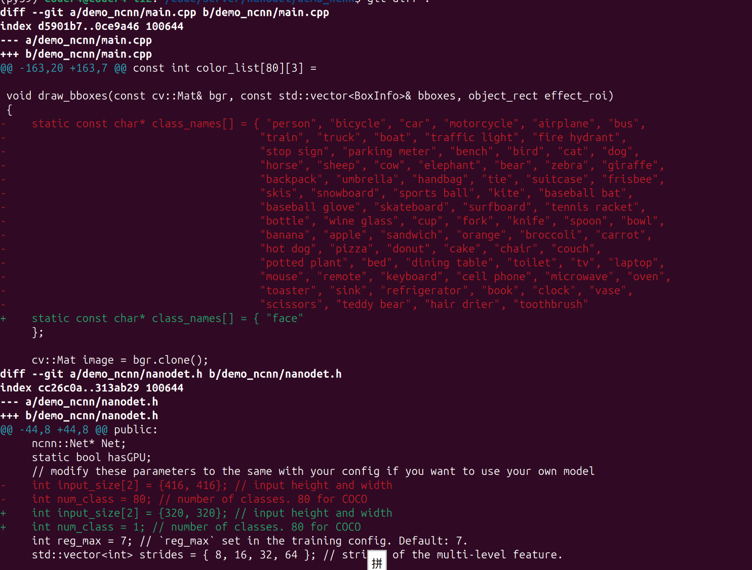 进入nanodet/demo/ncnn,修改以下点: