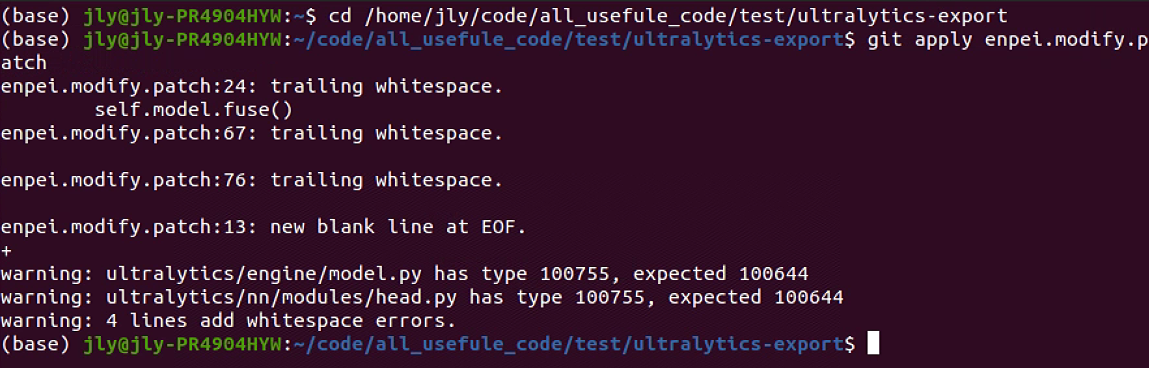 #进入ultralytics-export文件,进行代码修改 cd ultraytics-export #应用patch文件进行代码修改 git apply enpei.modify.patch