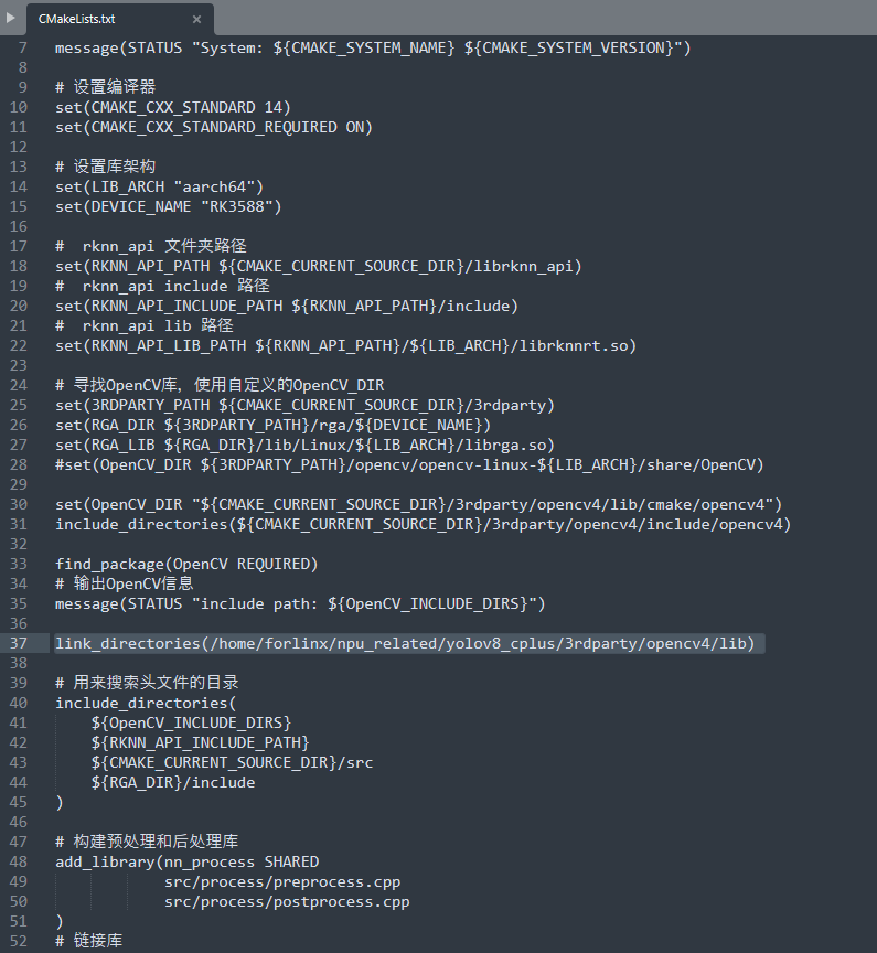 修改CMakeLists.txt文件第37行代码,把opencv的路径修改为自己板卡上的绝对路径