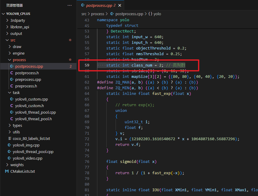 修改代码,文件/yolov8_cplus/src/postprocess.cpp中第 59 行代码,修改为自己需要检测类别的数量