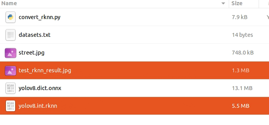 看到该界面就表示转换完成,可以在convert_rknn文件夹下看到多出来一个 yolov8.int.rknn模型和一个 test_rknn_results.jpg的推理结果,如果test_rknn_results.jpg的推理结果大致没啥问题,那么表示rknn转换无误了。