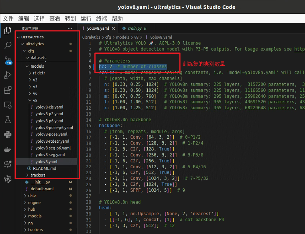 代码路径: /ultralytics/cfg/models/v8/yolov8.yaml 第5行修改为自己训练集需要检测目标的类别数量