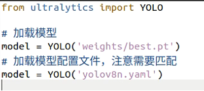 - 我使用的是最轻量化的v8n模型, 所以第一行代码中使用的 yolov8n.yaml,训练时,工程会自动匹配yolov8n的模型,并使用yolov8n.pt作为预训练模型