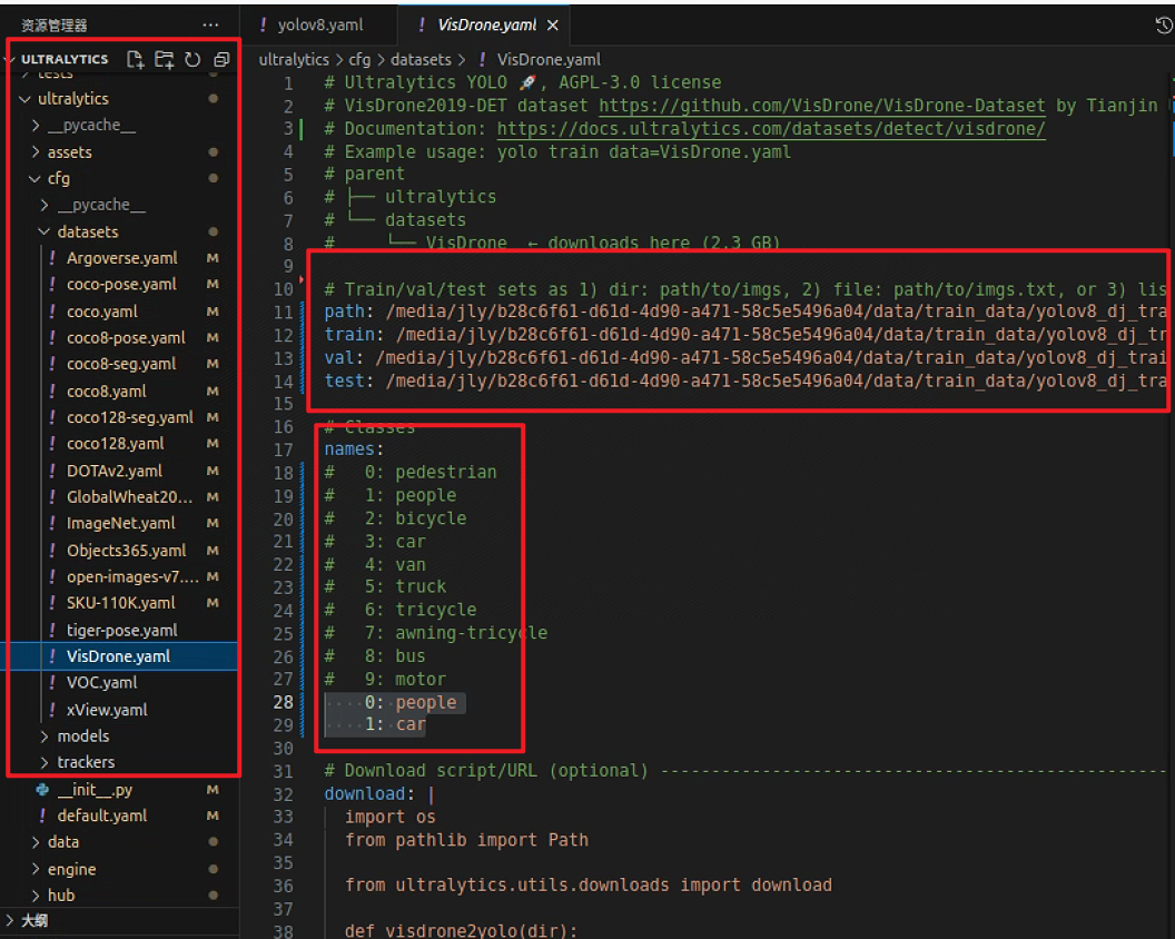 - 因为我使用的自定义数据集,我是基于VisDrone数据加上了自己的数据制作的训练集,所以加载的是改造后的VisDrone.yaml文件 数据的转换这里不仔细写了,以后空了我再补充在这里,但是需要注意的是,我是二分类,所以需要修改两处地方,否则训练出来的模型是不正确的